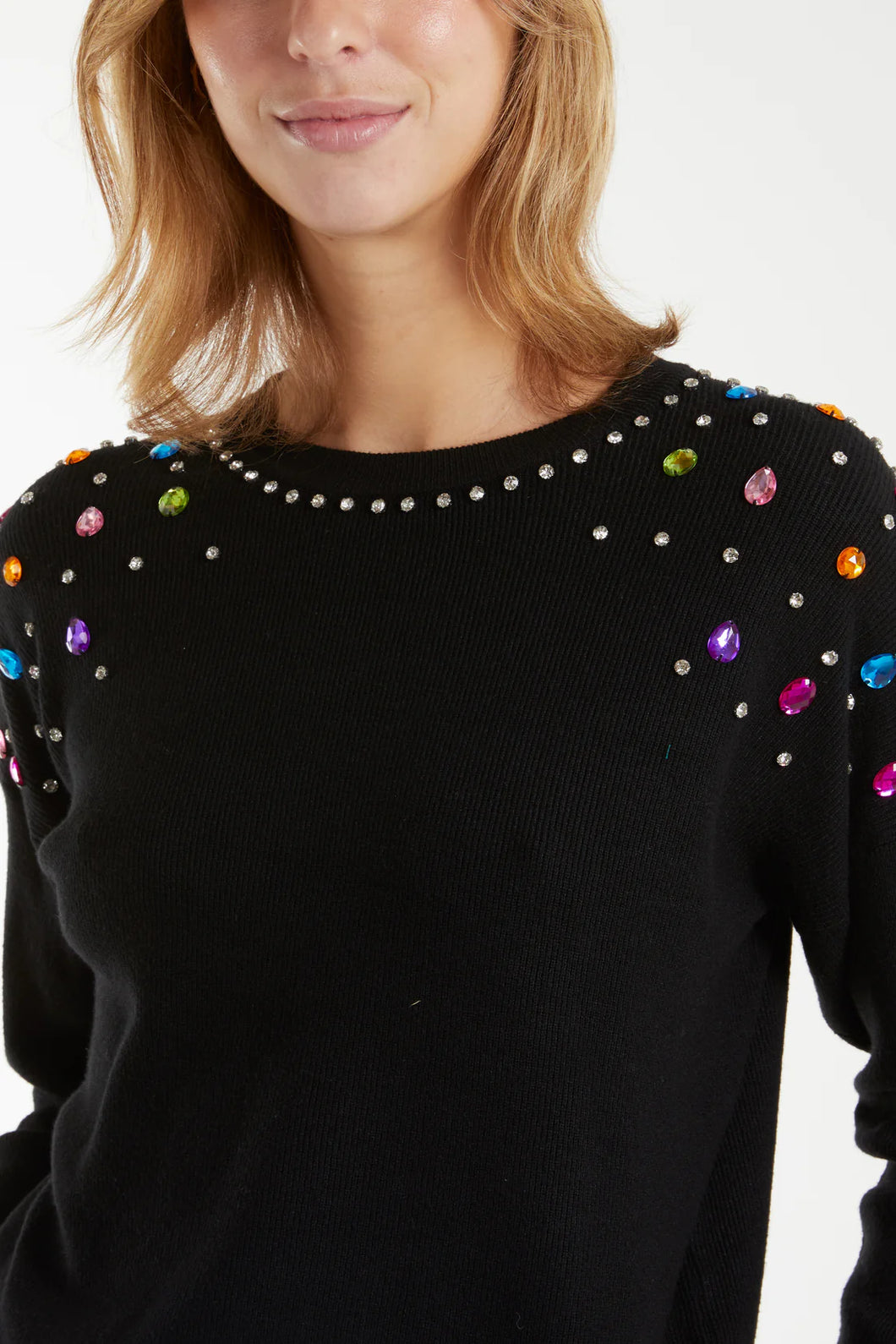 Crafted with a knit ribbed finish, this jumper combines texture and style effortlessly. It features a round neck beautifully embellished with sparkling diamantes, while multi-coloured gems on the shoulders add a touch of vibrant elegance.