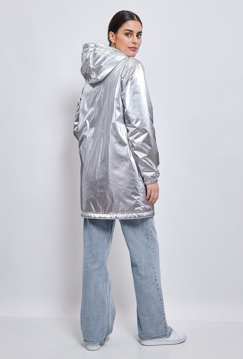 Stay stylish while braving the elements in this versatile padded parka. Designed with a slightly thick padding and a water-repellent finish, it keeps you warm and protected without compromising on style. The mid-length flared cut flatters the silhouette, while the metallic finish adds a modern edge to your outerwear collection.