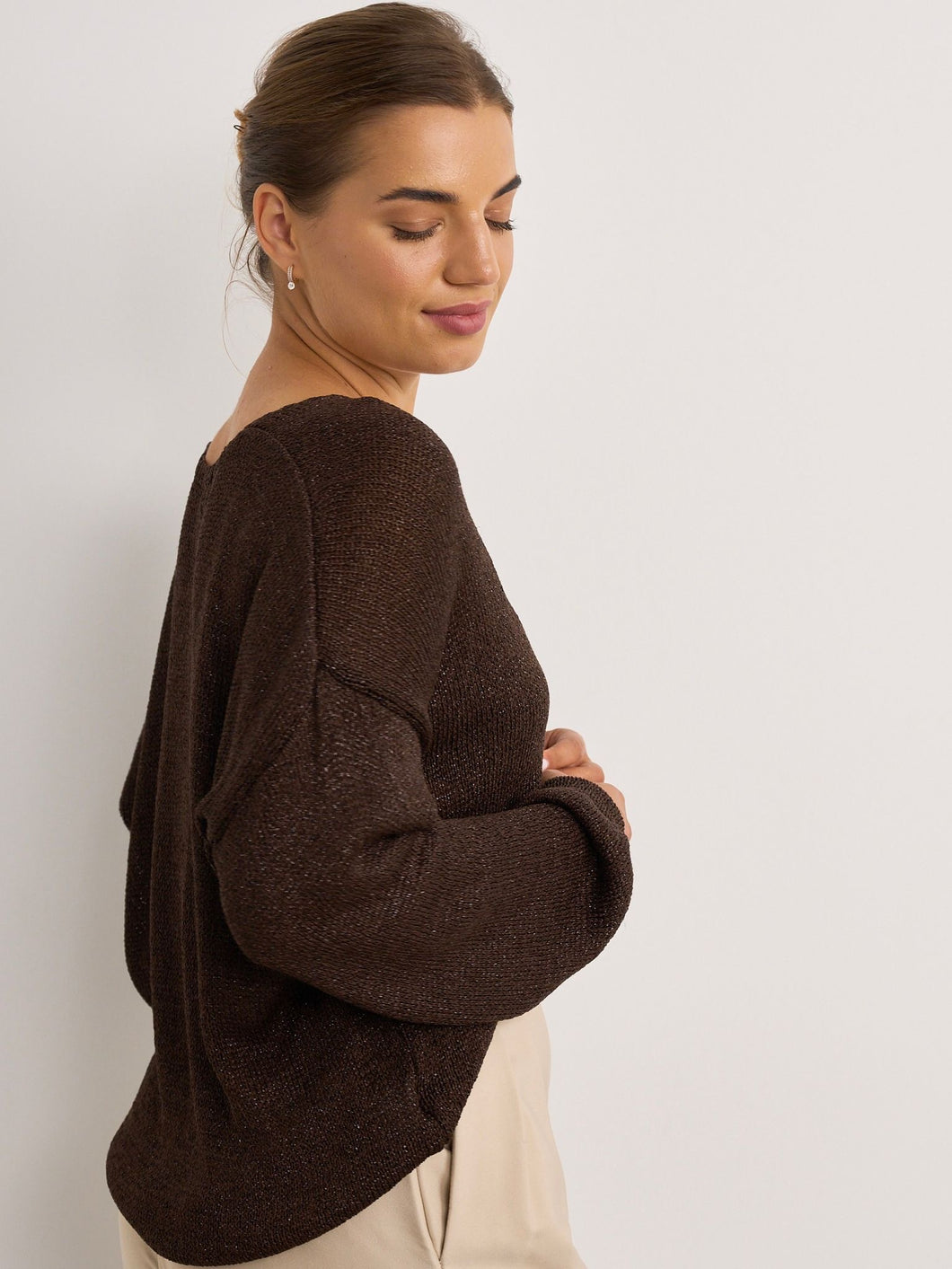 Elevate your everyday style with this rich chocolate brown cardigan, woven with a subtle lurex shimmer for a touch of understated glamour. Designed with a relaxed fit, deep V-neckline, and statement gold-toned buttons, it’s the perfect layering piece for both casual and dressy looks.